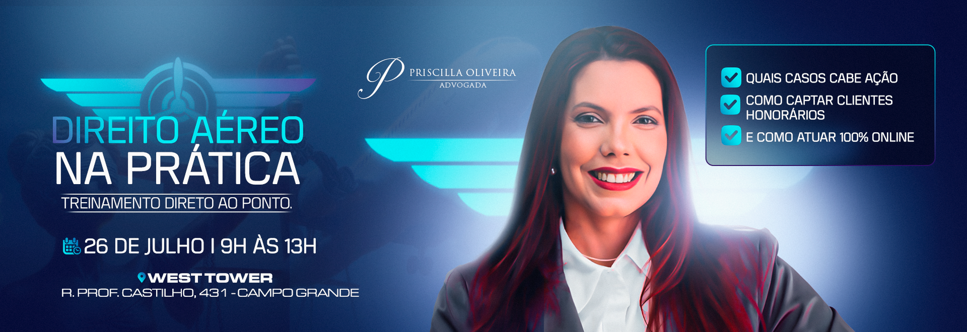 A Dra. Priscilla Oliveira, referência na área, te convida para um treinamento presencial e transformador, onde você vai aprender, de forma objetiva e prática, como atuar em casos de problemas em voos, captar clientes online e fechar honorários com segurança.
